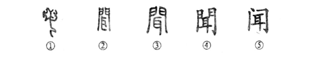 “春眠不覺(jué)曉,處處聞啼鳥(niǎo)?!边@個(gè)“聞”字原為會(huì )意字。甲骨文①的下部是面朝右的人形,人的頭上有一只大耳朵,這就突出了“聽(tīng)”的意思。②是戰國印文的形體,變成了外聲內形的形聲字,仍為“聽(tīng)”意。③是小篆的寫(xiě)法,與印文相似。④是楷書(shū)繁體字。⑤為簡(jiǎn)化字。