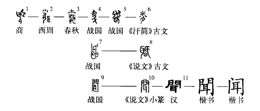 甲骨文聞為會(huì )意字,“象人跽而以手附耳諦聽(tīng)之形”(李孝定語(yǔ));西周金文形體發(fā)生訛變,為了追求字形的平衡,而將耳與身體割裂開(kāi)來(lái),置于其右,人形之上又增加裝飾性符號;春秋金文或加足趾形,與女旁相似;戰國文字有所省減,或省耳、或省人形,《汗簡(jiǎn)》之古文應由戰國文字演變而來(lái)。戰國時(shí)期聞?dòng)至碓煨温曌?,或從耳、昏聲,與《說(shuō)文》古文相合;或從耳、門(mén)聲,沿用至今。本義是聽(tīng)到,聽(tīng)見(jiàn)。《合集》2421:“庚子卜,永貞,妣己聞? ”《孟子·梁惠王上》:“聞其聲,不忍食其肉。”引申為被聽(tīng)到,即達到,傳布。《詩(shī)·小雅·鶴鳴》:“鶴鳴于九皋,聲聞?dòng)谔臁?/strong>”又引申指使聽(tīng)到,即報告。《合集》13651:“有疾齒,父乙唯有聞? ”又引申為聞名,著(zhù)稱(chēng)。由此引申為名譽(yù),聲望。作名詞,又指聽(tīng)到的東西,“見(jiàn)聞”主要指知識。又引申指傳聞,事跡。聞?dòng)种赣帽亲有釟馕?。?tīng)與聞是動(dòng)作與結果的關(guān)系。《禮記·大學(xué)》:“心不在焉,視而不見(jiàn),聽(tīng)而不聞。”(秦曉華)