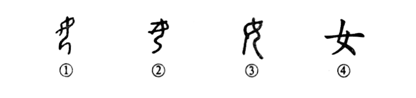 “卿唧復唧唧,木蘭當戶(hù)織。不聞機抒聲,惟聞女嘆息?!边@個(gè)“女”字是個(gè)惟妙惟肖的象形字。甲骨文①就像面朝左跪著(zhù)的一個(gè)人,上身是直立的,兩臂交叉在胸前。金文②基本上與甲骨文的形體相同,只是在“女人”的頭上多了一條橫線(xiàn),實(shí)為頭簪之類(lèi)的裝飾品。③是小篆的形體,不如甲骨文更像跪著(zhù)的人形。④是楷書(shū)的寫(xiě)法,變得完全沒(méi)有人形了。