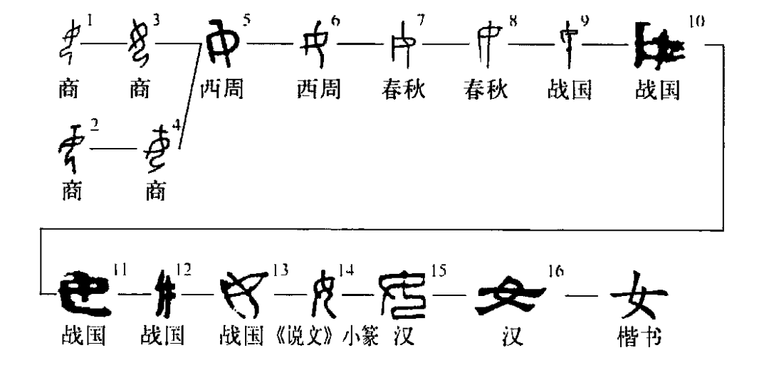 象形字。甲骨文“女”字像女子兩手胸前交叉、屈膝而跪的形狀?;蛴陬^部加一橫畫(huà)以示其頭飾,更顯女性特征。春秋金文屈膝而跪之狀已不顯,戰國文字承襲春秋金文,但筆勢略有變化。隸書(shū)已將屈膝之豎筆變?yōu)橐粰M筆,為楷書(shū)所本。本義指女性,與“男”相對。翏生??:“翏生眔大?其百男百女千孫。”《易·序卦》:“有男女,然后有夫婦。”這種意義的“女”讀為“nǚ”。從女性引申出以女嫁人義。《國語(yǔ)·越語(yǔ)上》:“請句踐女女于王,大夫女女于大夫,士女女于士。”第二個(gè)“女”作動(dòng)詞,以女嫁人。這種意義的“女”讀為“nǜ”。甲骨文“女”或讀為“母”。《合集》94:“隹(唯)女庚