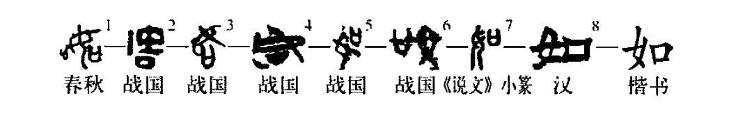 形聲字。從女,為“女”之分化字,口為分化符號,女亦聲。西周金文以“女”為“如”。戰國文字“如”字所從的“口”旁或在“女”下部,或在“女”旁的左部。本義是順從。《說(shuō)文》:“如,從隨也。”《左傳·宣公十二年》:“有律以如己也。”杜預注:“如,從也。”引申為似、像。《信陽(yáng)楚墓》1·4:“相保如芥。”《詩(shī)·王風(fēng)·采葛》:“一日不見(jiàn),如三秋兮。”郭店簡(jiǎn)“如”或讀為“諾”。郭店楚墓竹簡(jiǎn)《五行》45:“如(諾),莫敢不如(諾)。”(徐在國)