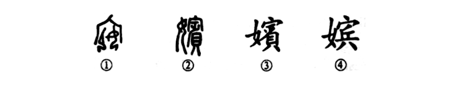 “藹藹綺庭嬪從列,峨峨紅粉扇中開(kāi)?!边@個(gè)“嬪”字為會(huì )意字,讀作pín。①是甲骨文的形體,其外部像房屋的形狀,屋內的左邊是一個(gè)面朝右的人,右邊是一個(gè)面朝左的人,從形體上看是個(gè)女人,為祀鬼神之意。②是小篆的形體,變成了左形右聲的形聲字。③是楷書(shū)的繁體字。④為簡(jiǎn)化字。