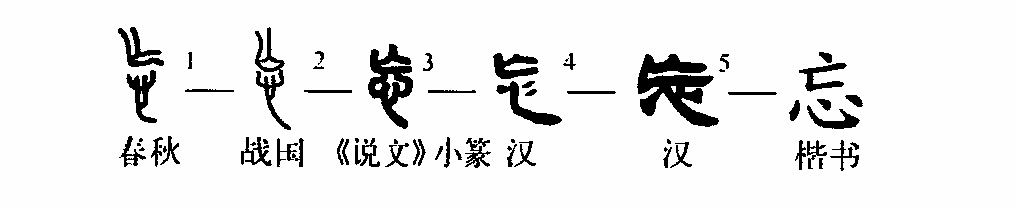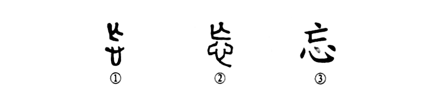 這是“樂(lè )而忘憂(yōu)”的“忘”字,是個(gè)會(huì )意兼形聲的字。①是金文的形體,上部為“亡(失去)”,下部為“心”,表示亡失了心中記憶之事。其結構應為“從亡從心,亡亦聲”。②是小篆的寫(xiě)法,與金文極相似。③是楷書(shū)的寫(xiě)法。