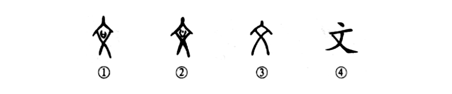 這個(gè)“文”字是個(gè)象形字。像什么呢?像一個(gè)心寬體胖的壯年人。你看甲骨文①就像正立的人形。最上端是頭,向左右伸展的是兩臂,下部是兩腿,胸前刻有美觀(guān)的花紋。金文②的形體基本上同于甲骨文,胸前的花紋更好看了。小篆③則把胸前的花紋省略了。④是楷書(shū)的形體,一點(diǎn)也看不出“人”形了。