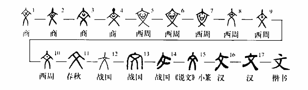 ,即刻畫(huà)之文飾也。 《禮記·王制》:‘東方曰夷,被發(fā)文身,有不火食矣?!资瑁骸纳碚?,謂以丹青文飾其身?!?《谷梁傳·哀公十三年》:‘吳,夷狄之國也,祝發(fā)文身?!蹲ⅲ骸纳?,刻畫(huà)其身以為文也?!嘉纳頌槌趺衿毡橹曀?。”于省吾主編《甲骨文字詁林》“文”字條后姚孝遂按:“朱芳圃以‘文’之本義為‘文身’之文,其說(shuō)可信。”據上諸說(shuō),則“文”字本作