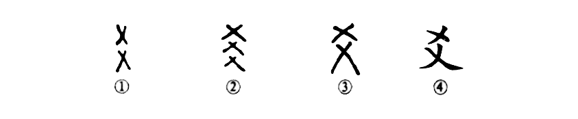 這是個(gè)“爻”字,本為象形字,讀作yáo。①是甲骨文的形體,像物與物互相交叉的形狀。②是金文的形體,像三物互相交叉的形狀。③是小篆的形體。④為楷書(shū)的寫(xiě)法,與甲、金文的形體一脈相承。