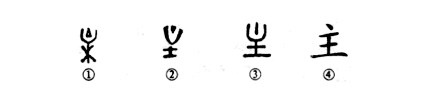 這是“圣堂一炷香”之“炷”的本字“主”,本為象形字。①是甲骨文,其下為“木”,其上為點(diǎn)燃的火形。②是戰國陶文的形體,最上部的一點(diǎn)是火苗,中間是裝油的燈盞之形,最下部為燈臺。所以這是一盞燈的形象。③是小篆的形體,也像燈形。④為楷書(shū)的寫(xiě)法。