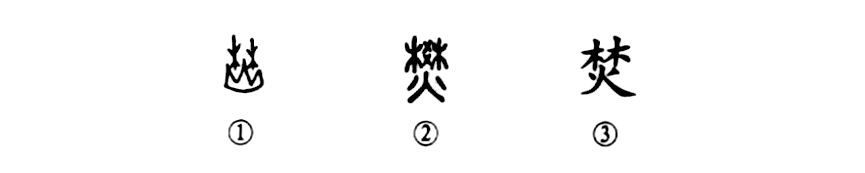 “地火峰林焚”的“焚”字也是個(gè)會(huì )意字。甲骨文①的上部是樹(shù)林,下部有一把大火(“山”字形),火燒山林謂之“焚”。②是小篆的形體,上部像“籬笆”之形,下部是“火”,仍然表示焚燒之義。到了楷書(shū)③又恢復了甲骨文的結構,書(shū)寫(xiě)也比小篆方便。