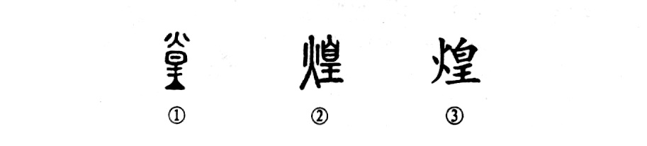 這是“煌煌熒熒”的“煌”字,本為象形字。①是金文的形體,燈上有火形,表示“明亮”之意。②是小篆的形體,變成了“從火,皇聲”的形聲字了。③是楷書(shū)的寫(xiě)法。
