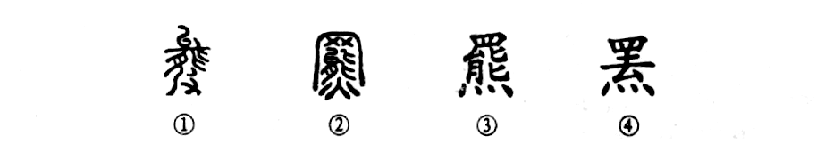 “獨有英雄驅虎豹,更無(wú)豪杰怕熊羆?!边@個(gè)“羆”字本為形聲字。①是《說(shuō)文》中古文的形體,其上部的“能”是“熊”的象形字;下部是“皮”,表聲??梢?jiàn)“羆”本是“從能,皮聲”的形聲字。②是小篆的形體,“熊”上增“網(wǎng)”。許慎說(shuō):“從熊,罷省聲?!庇殖蔀橐粋€(gè)新的形聲字了。③是楷書(shū)繁體字。④為簡(jiǎn)化字。