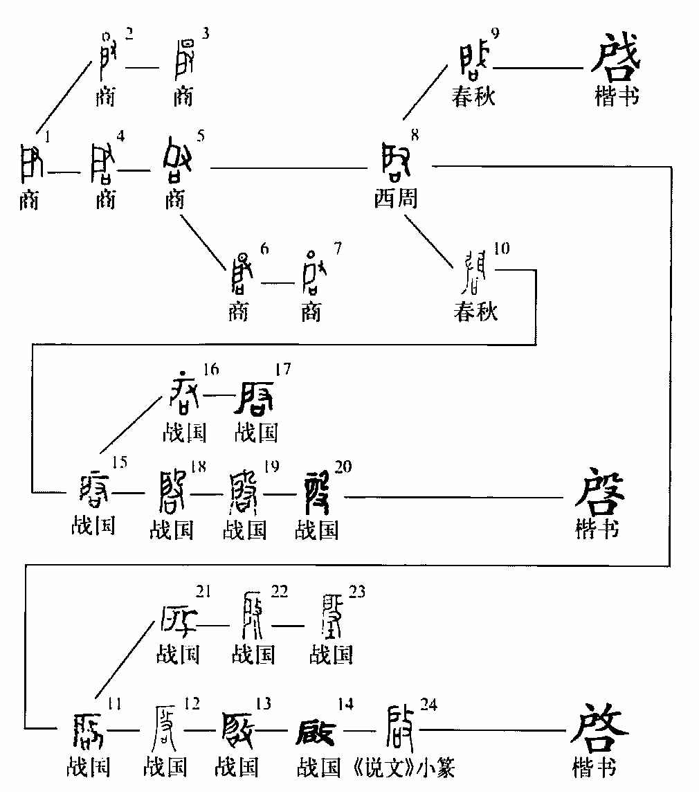 。構件“又”或作“戈”,以戈啟門(mén),雖行用不久,楷書(shū)卻出現了啔字。當時(shí)另一主要變化是構件攴代替了又(屬于形義皆近構件的互用),后來(lái)一直成為啟字的主流寫(xiě)法。到戰國時(shí),構件“攴”又有作“殳”者(亦屬于形義皆近構件的互用),此寫(xiě)法歷經(jīng)漢代,最終楷書(shū)又出現異體??。其時(shí)亦有省略口作??者,或易“口”為“土”作“