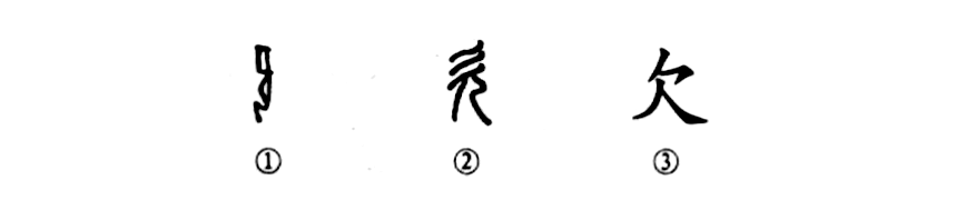 這個(gè)“欠”字也是個(gè)象形字.不用多分析你也能看出點(diǎn)意思來(lái)。甲骨文①是面朝右跪著(zhù)一個(gè)“人”,頭部朝右開(kāi)口處就是人張著(zhù)大嘴巴,打呵欠就是如此,所以這就是打呵欠的“欠”字。小篆②就變得不像人的樣子了,上部的三撇好像人的頭發(fā)或張口噴出的氣體??瑫?shū)③更看不出人打呵欠的形象了。
