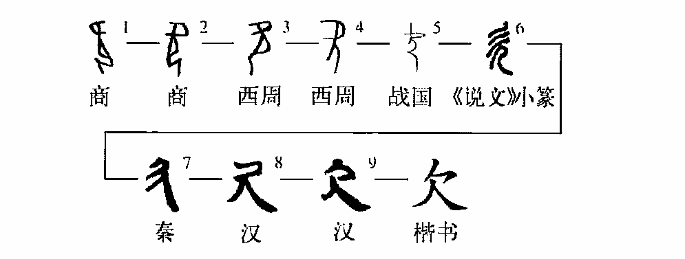 俱當釋‘欠’。”甲骨文之欠字,像人張口出氣之形,經(jīng)西周金文、戰國文字,一直到秦漢簡(jiǎn)帛,都無(wú)大的變化,西周、春秋、戰國和秦代出土文字資料中,不見(jiàn)單獨使用的欠字,但作偏旁的欠字習見(jiàn)。漢代印文中的欠字旁基本保持商周的寫(xiě)法,與之時(shí)代相同的《說(shuō)文》小篆欠字及欠字旁形體也應該是這種形體?!墩f(shuō)文》欠字及欠字旁作可能是后人根據《說(shuō)文》“欠,張口氣悟也”的說(shuō)解改造的,原篆不應如此。(周寶宏)