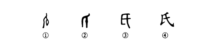 “氏”字本為象形字。甲骨文①是一個(gè)面朝右側立的人,手里提著(zhù)一個(gè)陶器之類(lèi)的東西。金文②的形體沒(méi)有大變,不過(guò)人手所提之物已上升到臂中間。③是小篆的形體,臂上的一點(diǎn)變成了一橫,同時(shí)也失去了人形。④是楷書(shū)的寫(xiě)法,由小篆直接演變而來(lái)。