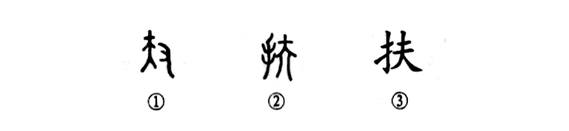 這是“抑強扶弱”的“扶”字。金文①的左邊是“夫”(“夫”就是“人”),有兩臂兩腿,最上部的一條橫線(xiàn)是頭上橫插的簪子,右下方是一只大手,表示用手扶人走路之意。②是小篆的形體,“夫”移到“手”的右邊了,而且也不太像“人”的形象。③是楷書(shū)的寫(xiě)法,它由小篆演變而成??梢?jiàn)“扶”字是一個(gè)會(huì )意字,若把它理解為“”形“夫”聲的形聲字那就錯了。