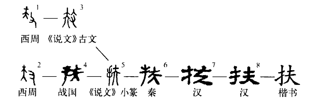 像手持半個(gè)竹。小篆上承戰國形體,“夫”移到“手”的右邊,而且也不太像“人”的形象。隸書(shū)、楷書(shū)的寫(xiě)法由小篆演變而成。《說(shuō)文》:“扶,左也。從手,夫聲。”段玉裁注:“‘左’下曰:手相助也。”所釋為引申義。本義是攙扶,扶持。《論語(yǔ)·季氏》:“危而不持,顛而不扶。”引申為幫助,支持。《戰國策·宋衛策》:“若扶梁伐趙,以害趙國,則寡人不忍也。”高誘注:“扶,助也。”由扶持義,又引申為護送。唐杜甫《別蔡十四著(zhù)作》:“主人薨城府,扶櫬歸咸秦。”對被攙扶的人來(lái)說(shuō),就是有了依靠,故又引申為拄著(zhù),持著(zhù)。漢賈山《至言》:“臣聞山東吏布詔令,民雖老羸癃疾,扶杖而往聽(tīng)之。”又虛化為介詞,表示方向,意為沿著(zhù)、順著(zhù)。晉陶潛《桃花源記》:“既出,得其船,便扶向路,處處志之。”(荊亞玲蔣曉薇)