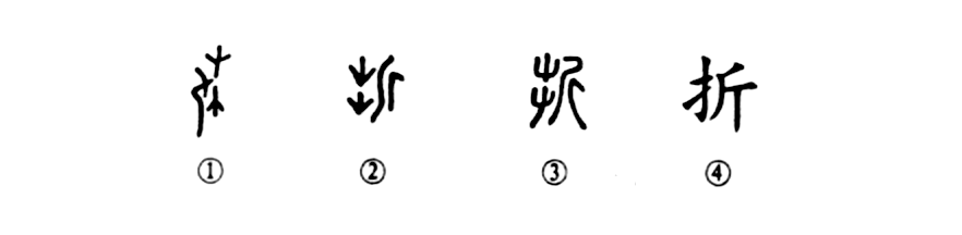 “春風(fēng)喚新葉,酷霜百卉折?!边@個(gè)“折”字是個(gè)會(huì )意字。甲骨文①就很形象,其左是一把曲柄橫刃大斧(斤),右邊是一棵小樹(shù)(木);木匠掄起大斧猛力一砍,把小樹(shù)攔腰砍斷(上部是樹(shù)頭,下部是樹(shù)根)。金文②則把斧頭移到了右邊,其左下部的樹(shù)根又顛倒了一下(樹(shù)根朝上),這就是金文所發(fā)生的偽變。到了小篆③又發(fā)生了第二次偽變,其左邊變成上下兩棵草,變成用斧頭砍草的意思了。等到楷書(shū)④又發(fā)生了第三次偽變,其左變成了一只手(提手旁),好像是說(shuō)以手拿大斧之義。