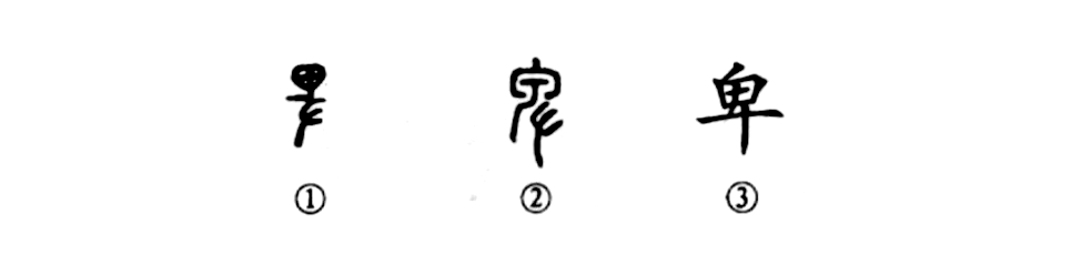 這是“居尊若卑”的“卑”字,本為會(huì )意字。①是金文的形體,左上部是一個(gè)橢圓形的酒器之形,下部為一只左手,表示奉酒器之意。②是小篆的形體,原來(lái)酒器之形訛變?yōu)椤凹住弊?。③為楷?shū)的寫(xiě)法。
