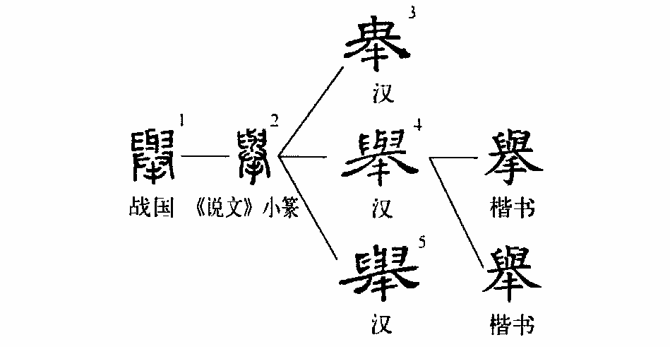 壺:“舉賢使能。”小篆從手,本作擧。清邵瑛《說(shuō)文群經(jīng)正字》:“今經(jīng)典作舉。隸變漢碑多如此作,今俗因之。”可見(jiàn),隸變以后,舉的下部由“手”變?yōu)?ldquo;