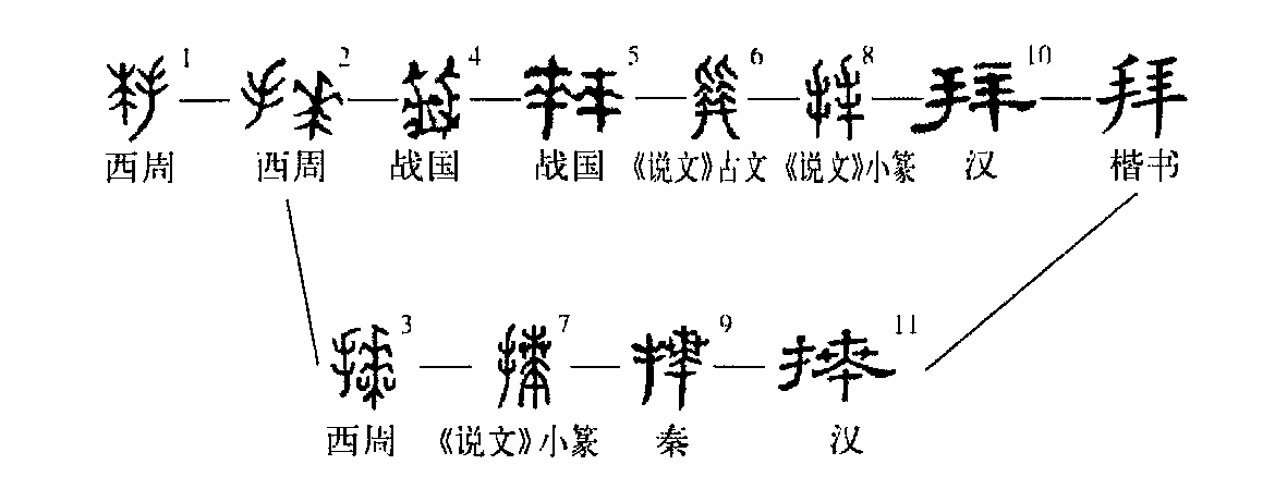 ,揚雄說(shuō),拜從兩手下。”所釋為“拜”之常用義。段玉裁《說(shuō)文解字注》:“首至手也,各本作首至地也,今正。首至地謂稽首,拜中之一,不可該九拜。‘拜’之名生于‘空首’。故許言首至手?!吨芏Y》之‘空首’,他經(jīng)謂之拜手。鄭注曰:‘空首,拜頭至手,所謂拜手也。’ ……詳言曰拜手,省言曰拜。拜本專(zhuān)為空首之稱(chēng),引申之則稽首、頓首、肅拜皆曰拜。”指雙手作揖,是表示敬意的一種禮節。《書(shū)·益稷》:“皋陶拜手稽首。” 《荀子·大略》:“平衡曰拜,下衡曰稽首。”拜是拱手彎腰,頭俯至手而不至地,如今之“揖”,稽首則是頭要觸到地面的一種禮節,二者有所不同。后來(lái)作為行禮的通稱(chēng),不僅指拱手彎腰而已,屈膝頓首、兩手著(zhù)地或叩頭及地等均為拜。《周禮·春官·大?!?/strong>:“辨九拜,一曰稽首,二曰頓首,三曰空首,四曰振動(dòng),五曰吉拜,六曰兇拜,七曰奇拜,八曰褒拜,九曰肅拜,以享右祭祀。”由表示敬意的禮節,虛化為敬辭,表示恭敬。宋曾鞏《北歸三首》其二:“拜捧恩書(shū)喜滿(mǎn)顏,馬蹄遙望斗杓還。”(荊亞玲 蔣曉薇)——李學(xué)勤《字源》