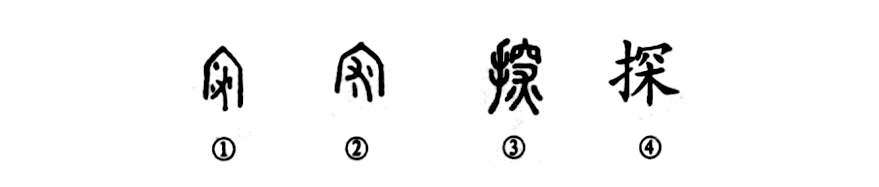 “探討意未窮,回艫夕陽(yáng)晚。”這個(gè)“探”字,本為會(huì )意字。甲骨文①的外形為洞穴,其內有一只大手,人手在穴中有所求,實(shí)為“探”之初文“”。②是金文形體,類(lèi)似于甲骨文。③是小篆的寫(xiě)法,左邊又增加了一只手,右邊也比甲、金文更繁了。④是楷書(shū)的寫(xiě)法。