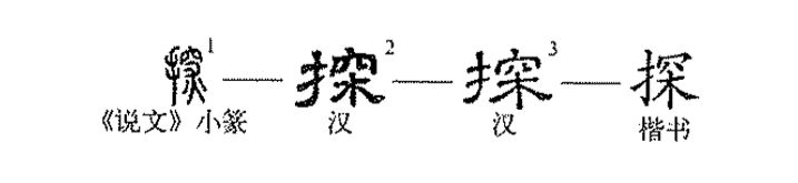 ”,漢隸中的聲符作“穼”,楷書(shū)中則簡(jiǎn)化為“罙”了。《說(shuō)文》:“探,遠取也。”朱駿聲通訓定聲:“遠取猶深取也。”本義是摸取,把手伸進(jìn)去取東西。《易·系辭上》:“探賾(zé,深奧,玄妙)索隱,鉤深致遠。” 《漢書(shū)·宣帝紀》:“毋得以春夏擿(tī,挑)巢探卵,彈射飛鳥(niǎo)。”引申為探究,試圖發(fā)現(隱藏的事物或情況)。由此引申為做偵察工作的人。由手伸出引申指身體某一部分向前伸等等。(方東杰)