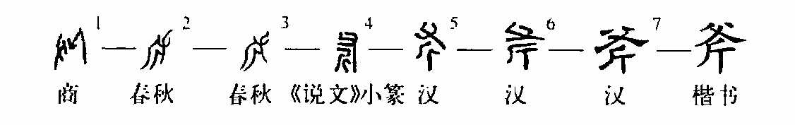形聲字。《說(shuō)文》:“斧,斫也。從斤,父聲。”斫指砍伐的意思。斧是用來(lái)砍伐樹(shù)木的工具,也用作砍伐人的刑具,用處很廣。斧字在商周墓葬中多有出土,與今天之斧基本相同。在甲骨文,斧字就已經(jīng)變?yōu)樾温曌?,但?ldquo;斧”字所從的“父”聲旁本是石斧的象形字,本作
