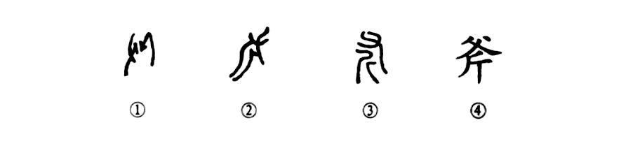 “林木茂而斧斤至焉。”這個(gè)“斧”字本為形聲字。①是甲骨文的形體。右邊是“斤(斧頭)”,表形;左為“父”,表聲。②是金文的形體。③是小篆的形體,變?yōu)樯下曄滦蔚男温曌?。④為楷?shū)的寫(xiě)法。