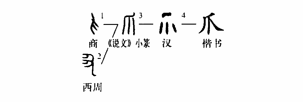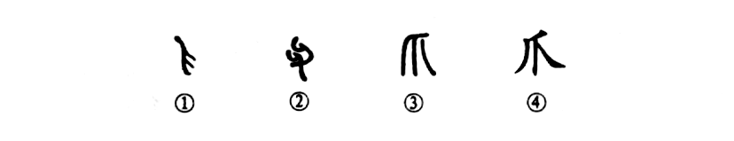 “爪”字是個(gè)象形字。甲骨文①就像一只指尖朝下的“爪”形。金文②的形體與甲骨文相反,是指尖朝上。③是小篆的形體,由甲骨文演變而來(lái)。④是楷書(shū)的寫(xiě)法,與小篆的形體相類(lèi)似。