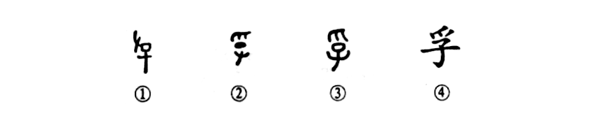 這是“激戰獲孚”的“孚”字。這個(gè)字是個(gè)會(huì )意字。甲骨文①的左上方是一只手,其下是“子”形(也就是“人”形),表明手抓“俘虜”之義。②是金文形體,大致與甲骨文的形體相似,手下捉了一個(gè)人。③是小篆的形體,與金文的形體大致相似。④是楷書(shū)的寫(xiě)法,仍然上部是“爪”(手),下部是“子”。