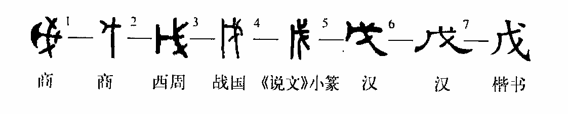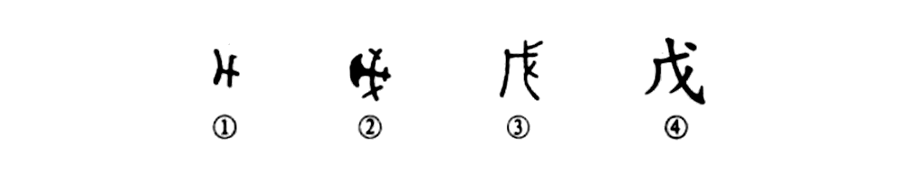 這個(gè)“戊”字是個(gè)象形字。甲骨文①像一把長(cháng)柄寬刃的大斧,刃部朝左,像彎月形。②是金文的形體,中間更像一把大斧之形。③是小篆的形體,沒(méi)有斧頭的模樣了。④是楷書(shū)的寫(xiě)法。