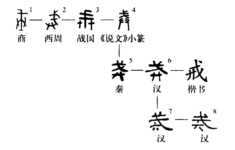 會(huì )意字。以雙手持戈會(huì )警戒意。《說(shuō)文》:“戒,警也。從廾持戈,以戒不虞。”論形說(shuō)義,都很精當?,F代漢語(yǔ)“警戒”、“戒備”中的“戒”,用的還是本義。(李守奎)