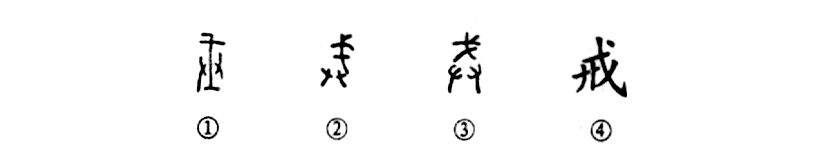 這個(gè)“戒”字是個(gè)會(huì )意字。甲骨文①的中間是一把長(cháng)“戈”,下部的左右兩側是緊握鋒戈的兩只手,以戒不備之敵。金文②的結構基本上與甲骨文相似,只是雙手均在戈的左下側。③是小篆的形體,是由金文直接演變而來(lái),不過(guò)雙手移到了戈下。④是楷書(shū)的寫(xiě)法,但形體發(fā)生了偽變,雖然“戈”形猶在,但雙手已變?yōu)?ldquo;廾”,根本沒(méi)有手形了。