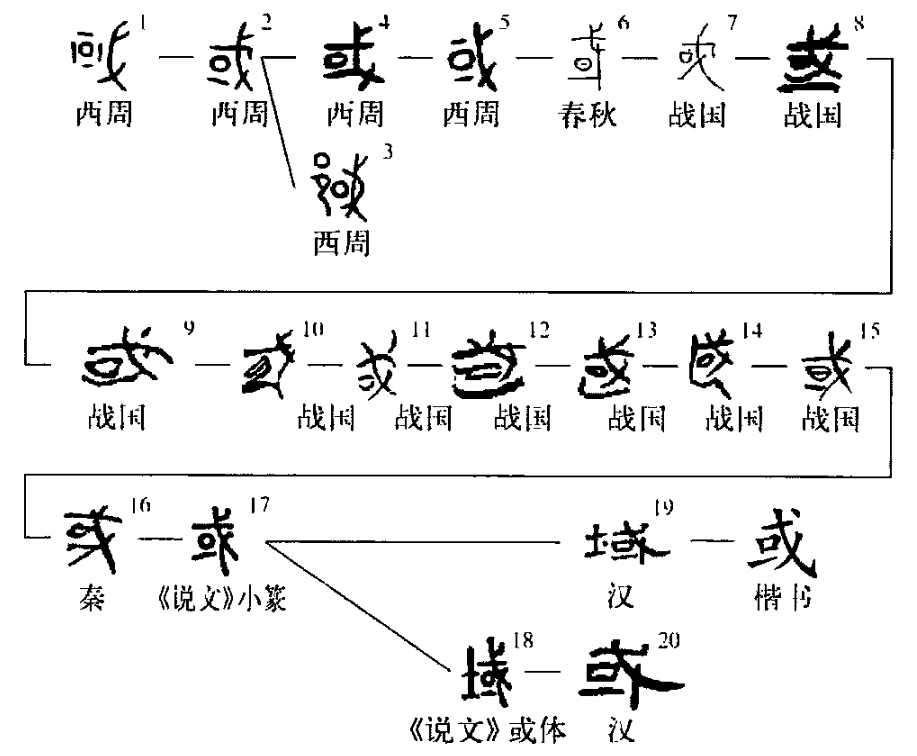會(huì )意字。從戈、從口,口像城形,會(huì )用戈守城之意。國之初文。西周金文“或”字或從口,從柲之初文。所從的“口”(城之初文)多是上、下加短橫以圍之,有的是上、下、左、右均加短橫以圍之,或“口”內加點(diǎn)為飾,還有贅加“邑”旁繁化的。春秋、戰國文字“或”承襲西周金文,或上、左、下短橫相連作“匚”形,遂分化出“國”字?!墩f(shuō)文》或字異體作“域”,加“土”繁化。后分化出“域”字。本義是邦國、封國。《說(shuō)文》:“或,邦也。”何尊:“余其宅茲中或。”師?簋:“弗跡我東或。”又指邊境、疆界。毛公鼎:“康能四或(域)。”《詩(shī)·商頌·玄鳥(niǎo)》:“肇域彼四海。”朱熹集傳:“域,封境也。”這些意義的“或”讀為yù。《包山楚簡(jiǎn)》120:“或殺下蔡人舒睪”(有人殺了下蔡人舒睪),“或”,代詞,相當于“有人”。《廣雅·釋詁一》:“或,有也。”齊镈:“勿或俞(渝)改。”(不要有所改變)清王引之《經(jīng)傳釋詞》:“或,猶又也。”??匜:“白(伯)揚父乃或(又)吏(使)牧牛誓曰。”這些意義的“或”讀為huò。(徐在國)
