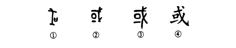 “或遲或速,或先或后。”這個(gè)“或”字是個(gè)會(huì )意字。①是甲骨文的形體,左邊是“戈”,中間的“口”表示城有墻垣,并有武器守衛,所以“或”字的本義就是“國家”的“國”。②是金文的形體,較甲骨文復雜了些,但字意未變。③是小篆的形體。④是楷書(shū)的形體,均從金文直接演變而來(lái)。