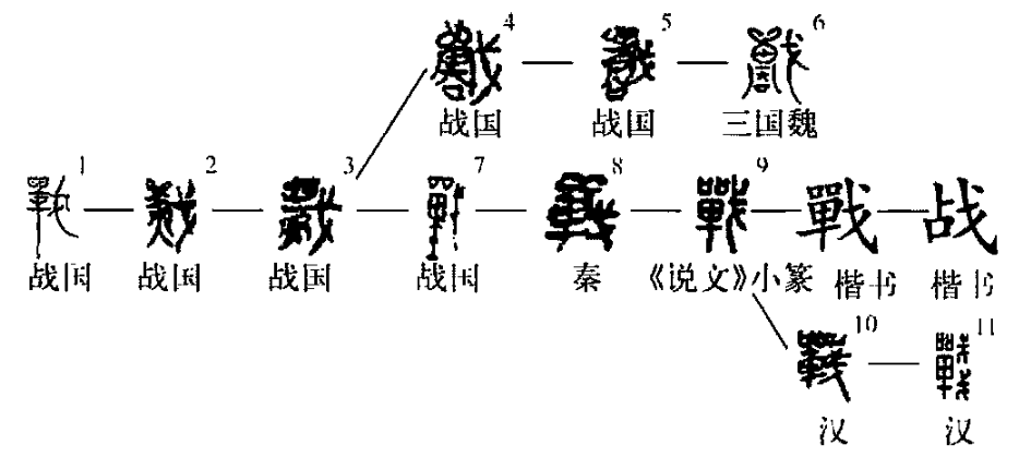 形聲字。從戈,單聲。戰國文字“戰”字或從戈、單聲,為《說(shuō)文》篆文所本。所從的“單”或加“口”繁化,遂與“獸”同形。三體石經(jīng)、馬王堆漢墓帛書(shū)“戰”字仍有從“嘼”者。漢印、居延漢簡(jiǎn)“戰”字或加“戈”旁繁化。“戰”字見(jiàn)于明末的官府文書(shū)檔案《兵科抄出》和清初的《目連記彈詞》中,后作為“戰”的簡(jiǎn)化字。本義是戰斗。《說(shuō)文》:“戰,斗也。”酓