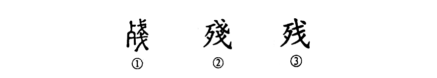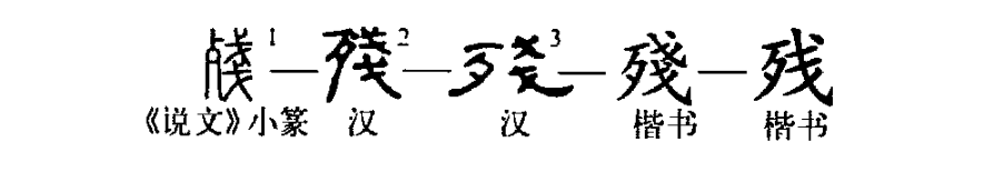 “短衣匹馬隨李廣,看射猛虎終殘年。”這個(gè)“殘”字本為會(huì )意兼形聲的字。①是小篆的形體,左為“歹(殘骨形)”,右為“戔”,是相重疊的兩把“戈”,表示殘殺之意,亦表聲。②是楷書(shū)繁體字。③為簡(jiǎn)化字。