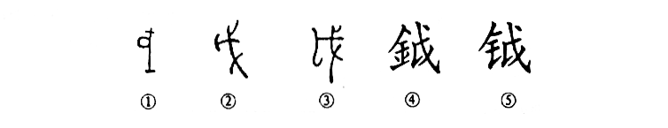 “戉”是“斧鉞”之“鉞”的本字,讀作yuè。甲骨文①就像商、周青銅兵器的形狀,上部朝左的部分是“鉞刃”(似斧頭),下部是長(cháng)柄,可見(jiàn)“戉”是個(gè)象形字。②是金文的形體,與甲骨文相似。③是小篆的形體,已經(jīng)看不出“鉞”的模樣了。④是楷書(shū),左邊又增加了形符“金”,成為左形右聲的形聲字了。⑤是簡(jiǎn)化字。