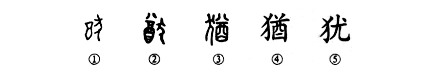 這是“猶豫不決”的“猶”字,本為會(huì )意兼形聲的字。甲骨文①的右邊是一條頭朝上背朝右的狗,左邊是盈尊的酒器之形,既表意也表音。本為犬守器之意。②是金文的形體,即“猷”字(《說(shuō)文》中有“猶”而無(wú)“猷”),其義不變。③是小篆的寫(xiě)法,④為楷書(shū)繁體字,⑤為簡(jiǎn)化字。