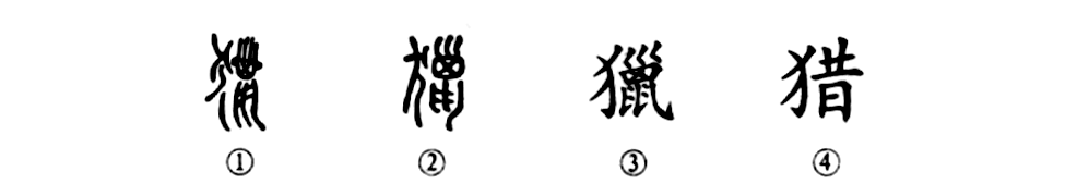 “鷹鹯獵食,難免困急。”這個(gè)“獵”字為形聲字。①是金文的形體。左為“犬”,表意;右為“巤”,表聲。②是小篆的形體,與金文相似。③為楷書(shū)的寫(xiě)法。④為簡(jiǎn)化字。