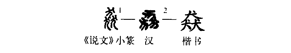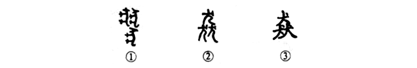 這是個(gè)“猋”(biāo標)字。金文①上邊是兩條狗(犬),下邊是一條狗,一共三條狗,它們都是頭朝上,尾朝下,腿朝左,背朝右。這個(gè)“猋”字的本義就是“眾犬狂奔貌”,所以是個(gè)會(huì )意字。②是小篆的寫(xiě)法,除筆形改變而外,整體也有變化,變成一“犬”在上,兩“犬”在下(一個(gè)漢字如是三個(gè)同體相重,均為上一下二,似乎已是一條規律)。③是楷書(shū)的寫(xiě)法。