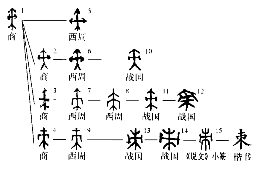 ”,是《說(shuō)文》的前身,均已不見(jiàn)所從尖刺之形。《說(shuō)文》:“朿,木芒也。象形。凡朿之屬皆從朿。讀若刺。”段玉裁注:“今字作刺。”有時(shí)也用為“棘”字的或體。(王志平)