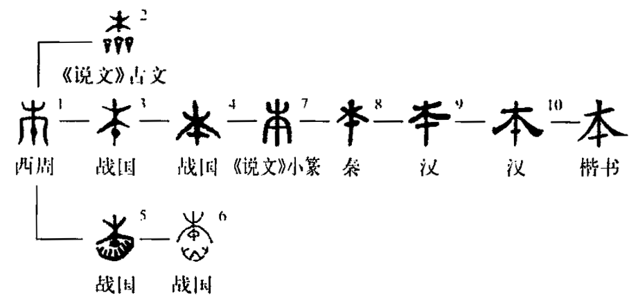 ”象征樹(shù)根。戰國文字或體(字形5、6)從臼(古者掘地為臼,在此表示樹(shù)坑),亦為強調樹(shù)根之意。本義是樹(shù)根。《說(shuō)文》:“木下曰本。”《國語(yǔ)·晉語(yǔ)一》:“伐木不自其本,必復生。”《淮南子·繆稱(chēng)》:“根本不美,枝葉茂者,未之聞也。”又指草木的莖、干。《廣雅·釋木》:“本,于也。”王念孫疏證:“干亦莖也。前《釋詁》云:‘莖、于,本也。’”《后漢書(shū)·李固傳》:“夫表曲者景(yǐng)必邪,源清者流必絜,猶叩樹(shù)本,百枝皆動(dòng)也。”比喻根本的、重要的事物,跟“末”相對。《荀子·議兵》:“今女(rǔ)不求之于本而索之于末,此世之所以亂也。”成語(yǔ)有“本末倒置”。又特指農業(yè),跟“末”(特指工商業(yè))相對。《荀子·天論》:“強本而節用,則天不能貧。”漢賈誼《論積貯疏》:“今背本而趨末,食者甚眾,是天下之大殘也。”(冀小軍)