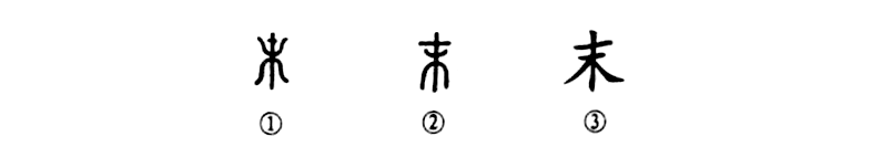這是“本末倒置”的“末”字。我們看金文①就像把一個(gè)“本”字倒過(guò)來(lái)的樣子,真是“本末倒置”了。其實(shí)“本”與“末”也正是完全相反的兩個(gè)字。金文①也是木(樹(shù)),上部為樹(shù)頭,下部為樹(shù)根,在樹(shù)梢上加一小短橫(指事符號),就表示這里是樹(shù)梢(梢:即有“末”義)??梢?jiàn)“末”字也是一個(gè)指事字。②是小篆形體。③是楷書(shū)形體,仍然是“木”上有一長(cháng)橫。
