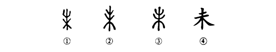 “來(lái)日綺窗前,寒梅著(zhù)花未?”這個(gè)“未”字本為象形字。①是甲骨文形體,像穗的形狀。郭沫若先生認為“未”就是“穗”的本字。②是金文的寫(xiě)法,類(lèi)似于甲骨文。③是小篆的形體。④是楷書(shū)的寫(xiě)法。