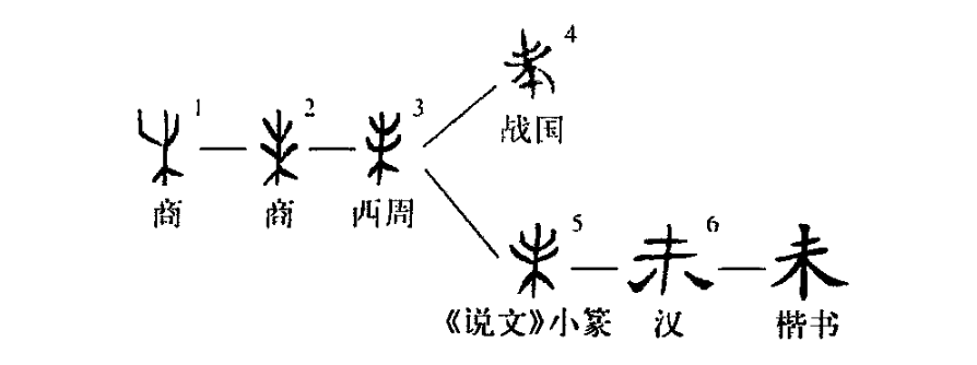 《說(shuō)文》:“未,味也。”不妥。其本義應為“穗”,后因“未”字被假借為地支第八位用了,所以再造一個(gè)“穗”字來(lái)代替“未”所表示的本義。