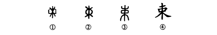 “束”字是個(gè)會(huì )意字。甲骨文①的外部的方圈是繩索之類(lèi),其中間有三根木柴,也就是用繩索捆綁木柴的意思。金文②是把方圈變?yōu)閳A圈,也是捆綁木柴之意。小篆③是繩圈在內,而“木”在外,不過(guò)變成了一條“木”了??瑫?shū)④是在“木”字的中間加一個(gè)扁“口”,也仍然是束木之意。