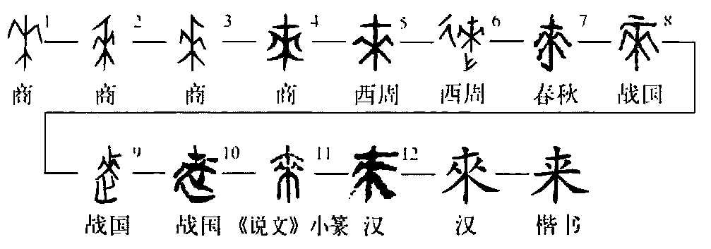 象形字。像麥子長(cháng)有麥穗芒朿之形。《說(shuō)文》:“來(lái),周所受瑞麥來(lái)麰也。一來(lái)二縫,象其芒朿之形。天所來(lái)也,故為行來(lái)之來(lái)。《詩(shī)》曰:‘詒我來(lái)麰(按《詩(shī)·周頌·思文》作:“貽我來(lái)牟”)。’”來(lái)的本義指小麥。商代文字較為象形,當時(shí)已經(jīng)出現為了突出指麥穗,在字上端加一橫的字形。這一寫(xiě)法為西周、春秋戰國文字所承襲,但象形意味逐漸減弱。西周至戰國來(lái)字都有繁復寫(xiě)法,即字從
