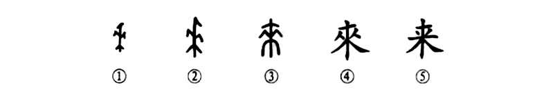 我們在讀《詩(shī)經(jīng)•周頌•思文》時(shí),會(huì )見(jiàn)到“貽我來(lái)牟(大麥)”的一句話(huà)。“貽我來(lái)牟”就是贈送我小麥、大麥的意思。這個(gè)“來(lái)”字的本義怎么是“小麥”呢?看了甲骨文就會(huì )了解。甲骨文①多像一棵成熟了的小麥!上部是麥穗,中間的兩側是麥葉,下部是麥根。金文②大體上與甲骨文相似,只是麥穗朝右垂(其實(shí)左右皆有)。③是小篆的形體,把麥穗變成了左右兩個(gè)??瑫?shū)④則把小篆的左右兩穗變成了一橫,后來(lái)則借草體楷化“來(lái)”。⑤是簡(jiǎn)化字。