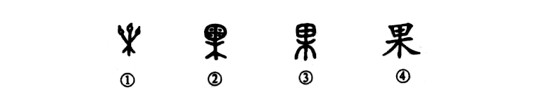 ?這是“碩果累累”的“果”字。這是個(gè)象形字。甲骨文①的下部是“樹(shù)”(木),樹(shù)梢上結滿(mǎn)了果實(shí)。②是金文的形體,是在“木”上長(cháng)了一個(gè)又圓又大的果實(shí)。③是小篆的形體。④是楷書(shū)的寫(xiě)法,都是由金文演變而來(lái)的。